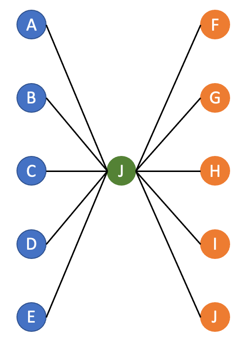 To improve on it, we can introduce a single role: the hub. Everyone communicates with the hub, and then the hub ensures all the relevant information is pushed to each person.