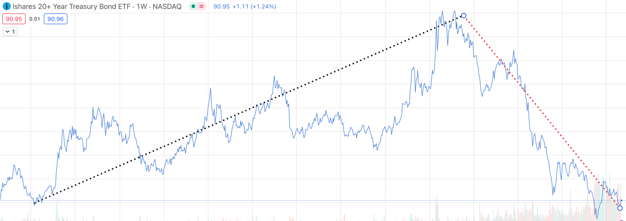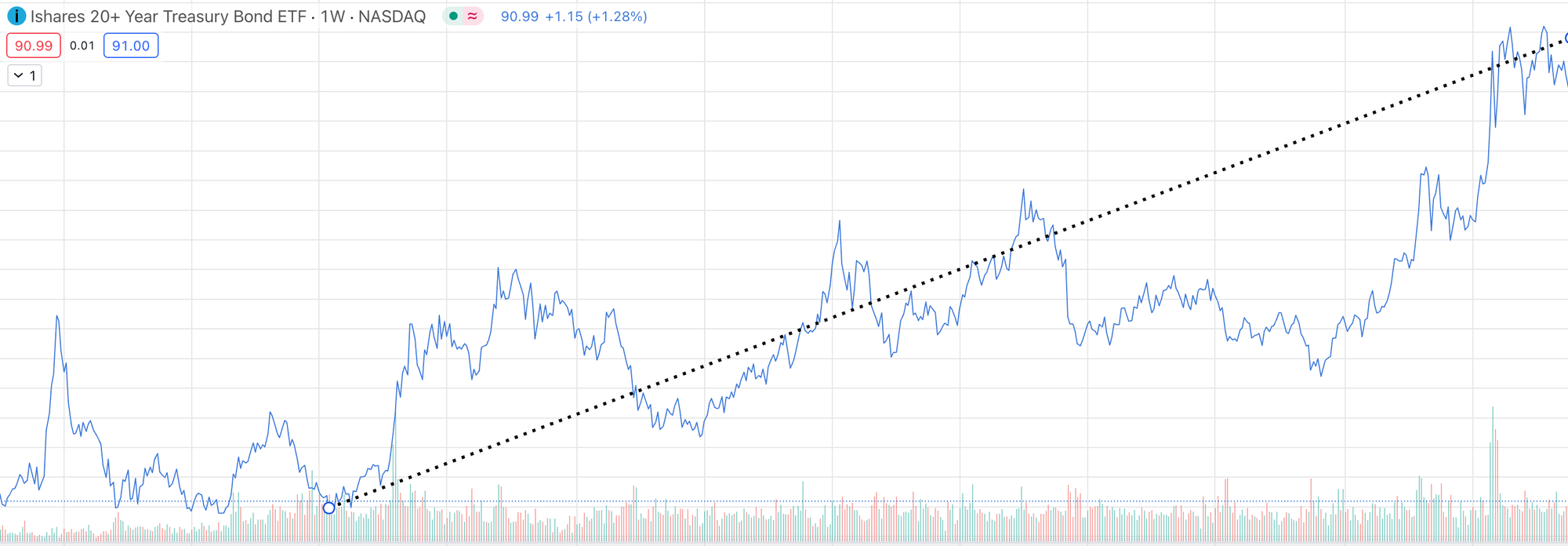 First of all, let's agree that from 2010 to the end of 2020, bonds were on a one-way trip to the moon. Here's a chart of TLT, a 20-year bond fund, over that time: